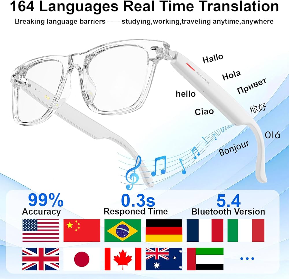 The glasses support live translation in multiple languages — perfect for travel, business, or communication across cultures.